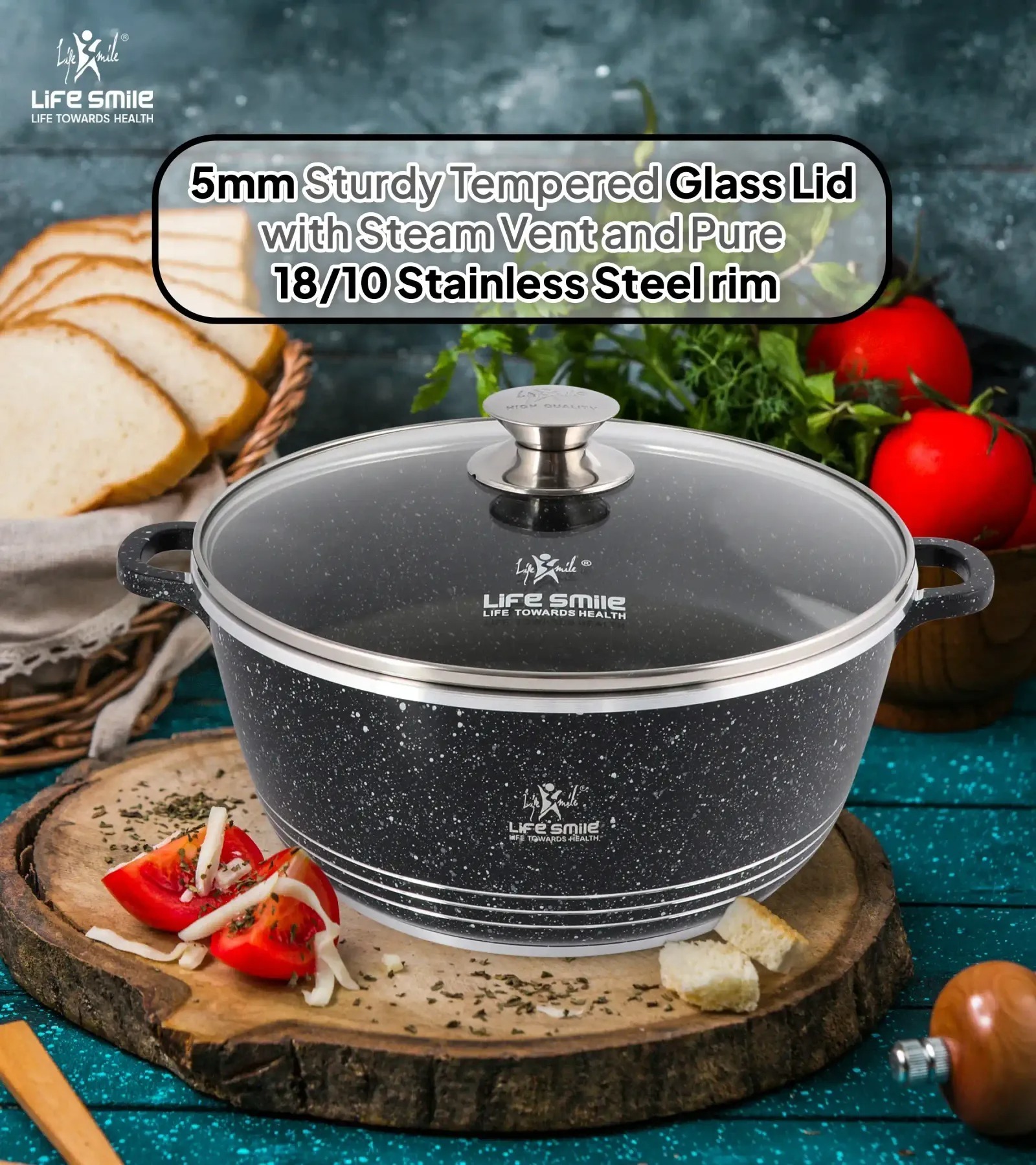 اطلاعات بیشتر درباره این محصول سرویس قابلمه لایفاسمایل با گرانیت تیتانیوم نچسب، دربهای دارای دریچه، پایه القایی، گرمایش از کف القایی و دستکشهای مقاوم در برابر حرارت.